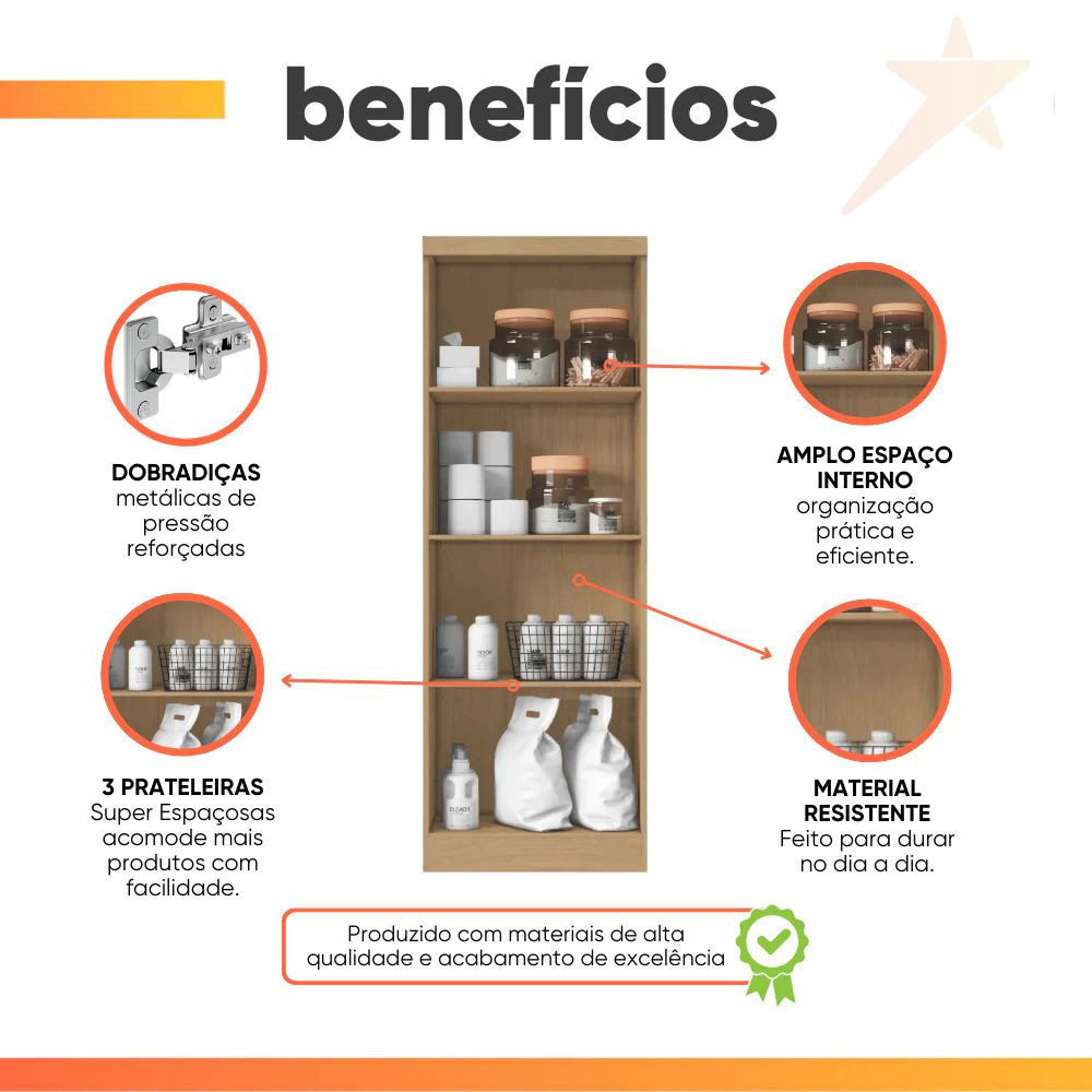 O Armário Multiuso New é ideal para diversos ambientes de sua casa, lavanderia, quarto ou ambientes de trabalho. Possui 3 prateleiras internas bem distribuídas, amplo espaço de armazenamento, acabamento em verniz texturizado fosco e verniz brilhoso nas portas – proporcionando a conservação do móvel -, e sapatas plásticas que não agridem o piso. Confeccionado com materiais de qualidade garantindo maior durabilidade e resistência.