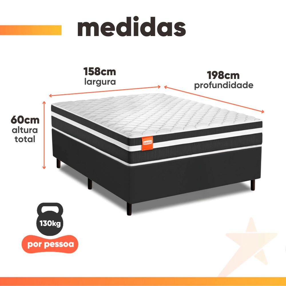 MEDIDAS: [ A ] = 60 cm / 48 cm ( sem pés) [ L ] = 158 cm [ P ] = 198 cm PESO SUPORTADO: 130 kg por pessoa PESO: 55,7 kg ALTURA DOS PÉS: 12 cm MODELO: Cama Box Queen Molas Ensacadas Bali 158x198x60cm MARCA DO COLCHÃO: CBP MARCA DO BOX: Prince REVESTIMENTO SUPERIOR E LATERAL: Tecido Jacquard matelado, que proporciona um toque macio, elegante e resistente, contribuindo para maior conforto e durabilidade REVESTIMENTO INTERNO: Estrutura de molas ensacadas individualmente, que suportam até 130kg por pessoa, oferecendo estabilidade e conforto durante o sono ESPUMA: Camada de espuma D28 dentro dos padrões ABNT, de alta qualidade, que proporciona conforto na medida certa TECIDO BOX: Suede elegante e resistente ESTRUTURA: Madeira de Eucalipto e Pinus, resistente e duradoura PÉS: 6 unidades em plástico de alta resistência ITENS INCLUSOS: 1 Colchão Queen (158cm), 1 Box (158cm) INSTRUÇÕES E CUIDADOS: Utilizar em local seco e arejado, não dobrar, fazer giro quinzenalmente no sentido pés/cabeceira GARANTIA DO COLCHÃO: 12 meses pelo fabricante GARANTIA DO BOX: 3 meses pelo fabricante