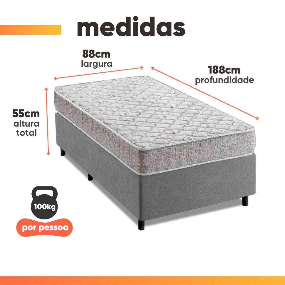 MEDIDAS: [ A ] = 55 cm / 43 cm (sem os pés) [ L ] = 88 cm [ P ] = 188 cm PESO SUPORTADO: 100 kg por pessoa PESO: 28kg ALTURA DOS PÉS: 12 cm MODELO: Cama Box Casal Espuma D33 Inducol Soft 88x188x55cm MARCA DO COLCHÃO: CBP MARCA DO BOX: Prince REVESTIMENTO SUPERIOR E LATERAL: Tecido matelado em poliéster, que une maciez, resistência e acabamento sofisticado REVESTIMENTO INTERNO: Espuma de alta qualidade D33 dentro dos padrões ABNT que garante firmeza, durabilidade e o suporte ideal para uma noite de sono mais confortável REVESTIMENTO INFERIOR: Tecido matelado poliéster ESPUMA: D33 de alta performance TECIDO DO BOX: Suede elegante e resistente ESTRUTURA: Madeira de Eucalipto e Pinus, proporcionando maior estabilidade e durabilidade PÉS: 6 unidades MATERIAL DOS PÉS: Plástico resistente DIFERENCIAIS DO COLCHÃO: Espuma D33 de alta qualidade, que garante maior firmeza e suporte ao corpo. Revestimento matelado em poliéster, que proporciona maciez e um acabamento sofisticado. Estrutura desenvolvida para maior durabilidade e conforto ITENS INCLUSOS: 1 Colchão Solteiro (88cm), 1 Box Solteiro (88cm) INSTRUÇÕES E CUIDADOS: Utilizar em local seco e arejado, não dobrar, fazer giro quinzenalmente no sentido pés/cabeceira GARANTIA DO BOX: 3 meses pelo fabricante GARANTIA DO COLCHÃO: 12 meses pelo fabricante