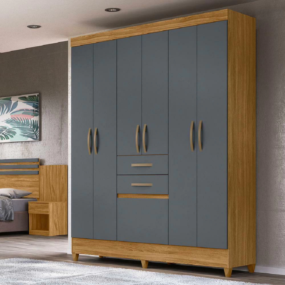 NOME: Guarda Roupas Casal New Mafra MARCA: Moval COR: Freijó / Cinza MEDIDAS: A: 204 cm L: 177 cm P: 47 cm MATERIAL: MDP ACABAMENTO: Impressão UV (Ultravioleta) PORTAS: Sim, 7 GAVETAS: Sim, 2 PRATELEIRAS: Sim, 3 prateleiras internas CORREDIÇAS: Metálicas PUXADORES: 8 puxadores com acabamento cromados PÉS: Em PVC ESPELHO: Não possui espelho DIFERENCIAL: Nicho inferior com opção de sapateira PESO: 98kg SISTEMA DE MONTAGEM: Parafusos GAVETAS SUPORTAM: 6kg PRATELEIRAS SUPORTAM: 6kg