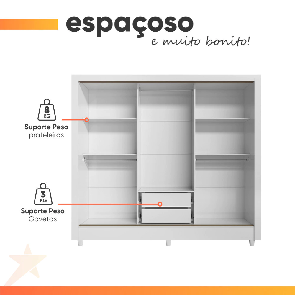 MEDIDAS: [ A ] = 191 cm [ L ] = 172 cm [ P ] = 46 cm PESO: 81,05kg PESO SUPORTADO: 77kg PRATELEIRAS SUPORTAM ATÉ: 8kg GAVETAS SUPORTAM ATÉ: 3kg MODELO: Guarda Roupas Casal com 3 Portas de Correr 2 Gavetas França MARCA: Santos Andirá ACABAMENTO: Verniz Brilhante MATERIAL DA ESTRUTURA: MDP/MDF ESPESSURA DO MATERIAL: 12/15mm PORTAS: 3 TIPO DE PORTA: Correr POSSUI ESPELHO: Não GAVETAS: 2 CORREDIÇA: Metálicas PRATELEIRAS: 5 MATERIAL DO PUXADORES: ABS CABIDEIROS: 3 MATERIAL DOS CABIDEIROS: Alumínio PÉS: 6 MATERIAL DOS PÉS: PVC INSTRUÇÕES E CUIDADOS: Utilizar panos secos ou úmidos, não utilizar produtos abrasivos ou químicos. SISTEMA DE MONTAGEM: Parafusos, Cavilha, Minifix. GARANTIA: 3 Meses.