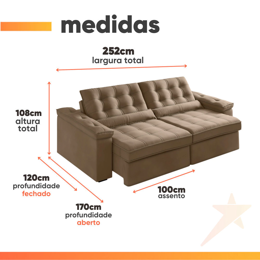 MEDIDAS: A = 108 cm L = 252 cm P = 170 cm (Aberto) / 120 cm (Fechado) PESO SUPORTADO POR ASSENTO: 130 kg PESO: 100 kg MODELO: Sofá Retrátil e Reclinável 4 Lugares 2,52m Veludo Ilhéus MARCA: Bex's Estofados ESTRUTURA: Madeira de reflorestamento, oferecendo resistência, durabilidade e qualidade TIPO DE SOFÁ: Retrátil e reclinável com encosto ajustável em 3 posições para máximo conforto MOLAS: Molas ensacadas, garantindo firmeza e maciez no assento ASSENTO: Espuma HR26 de alta qualidade, que une conforto e longa vida útil, dentro dos padrões ABNT QUANTIDADES DE LUGARES: 4 lugares ENCOSTO: Fibra de silicone, removível que facilita transporte e reclinável com 3 posições REVESTIMENTO: Tecido em Veludo macio ao toque, com acabamento sofisticado BRAÇOS: Espuma, que oferecem apoio confortável PÉS: 8 unidades em plástico resistente, com rodízios que facilitam a movimentação DIFERENCIAL: Braços almofadados e almofadas decorativas soltas / Assentos com molas ensacadas e espumas HR26 / Encosto ajustável em 3 posições / Almofadas e braços em espuma e fibra de silicone. INSTRUÇÕES E CUIDADOS: Para manter a beleza do sofá, utilize pano úmido ou aspirador. Evite produtos abrasivos. GARANTIA: 3 Meses.